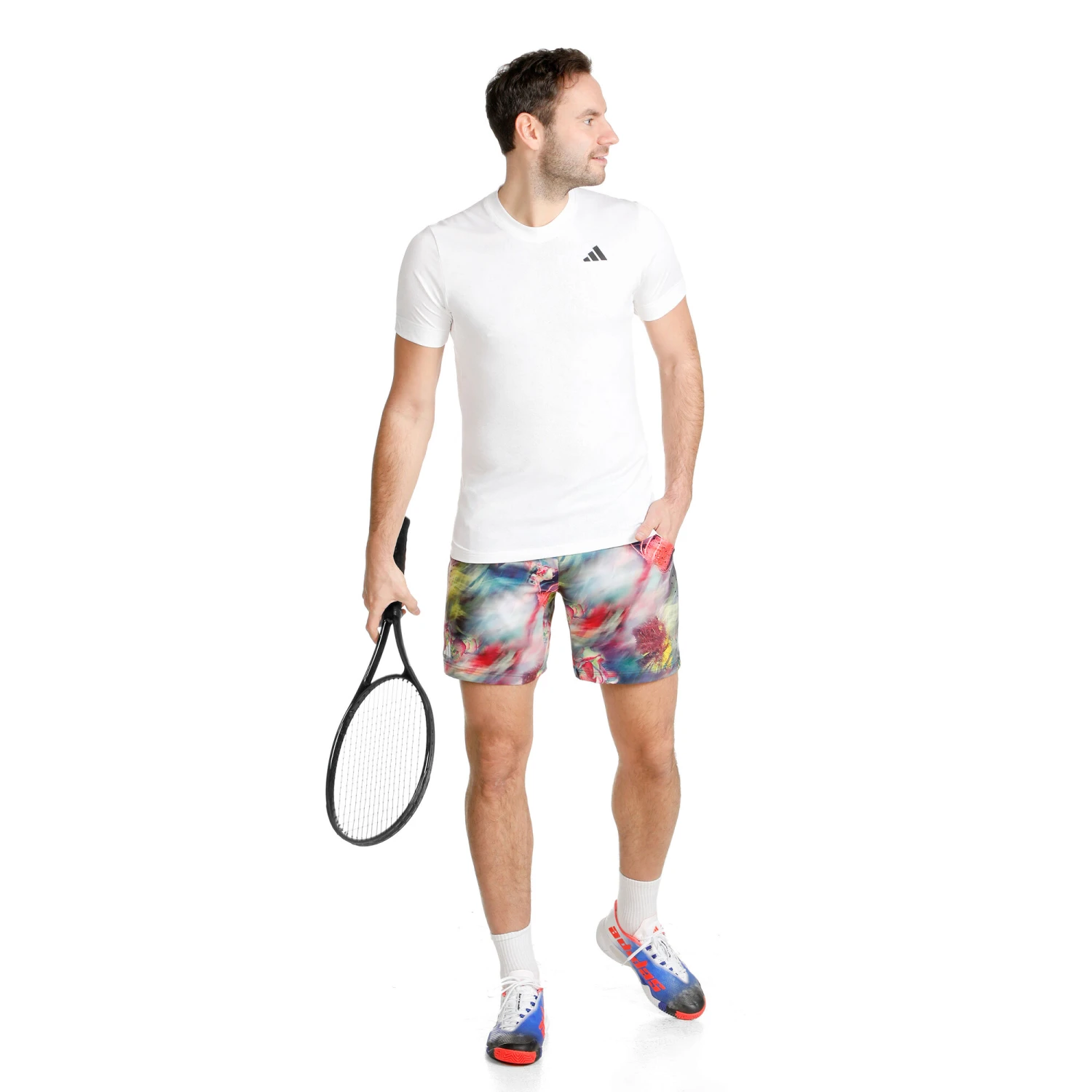 - Allover-Print, breiter Bund, Bund gerippt, Bund mit Gummizug, Bund mit Zugband, elastischer Bund, gedrucktes Logo, Seitentaschen, Zugband außenliegend